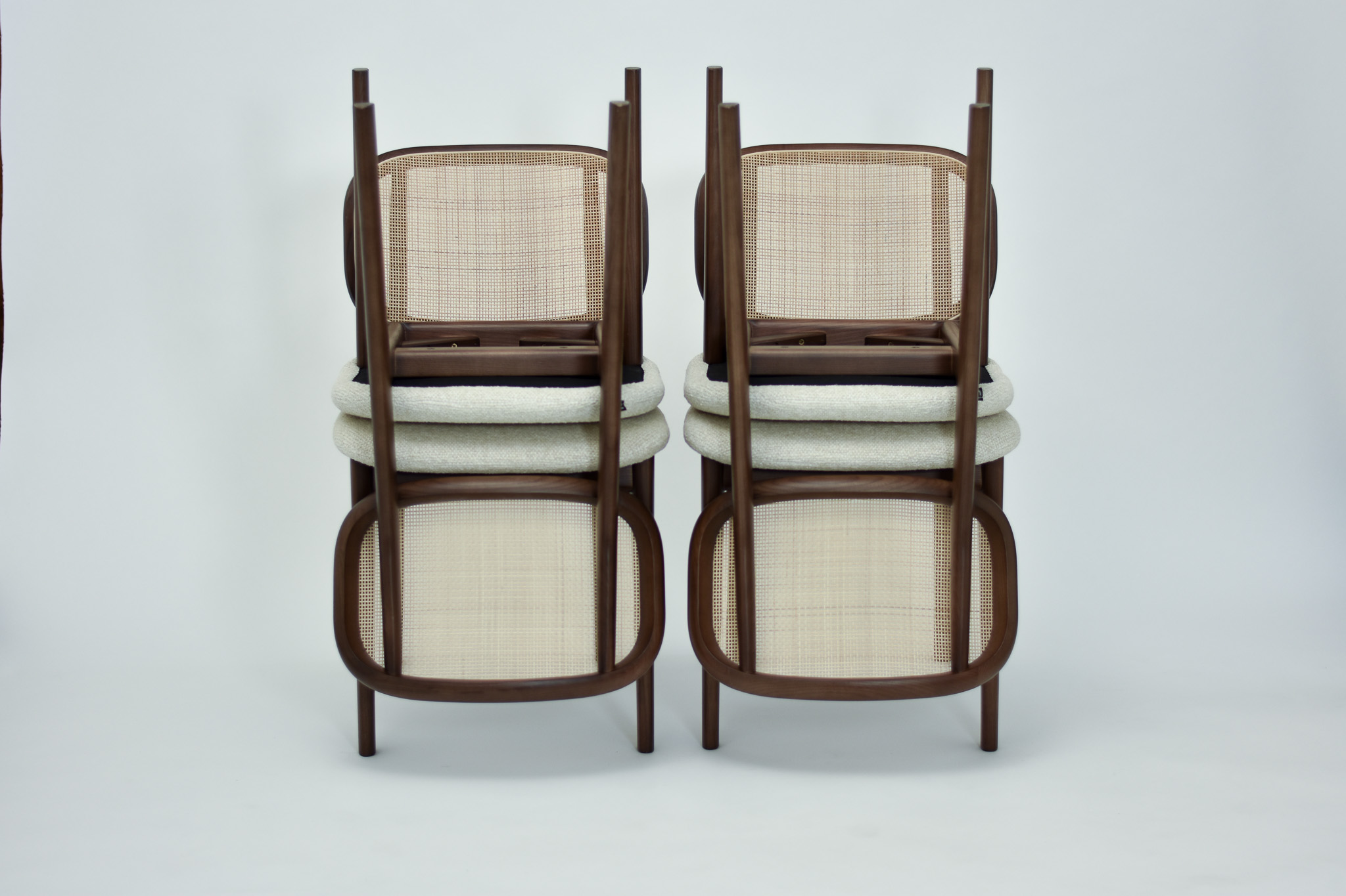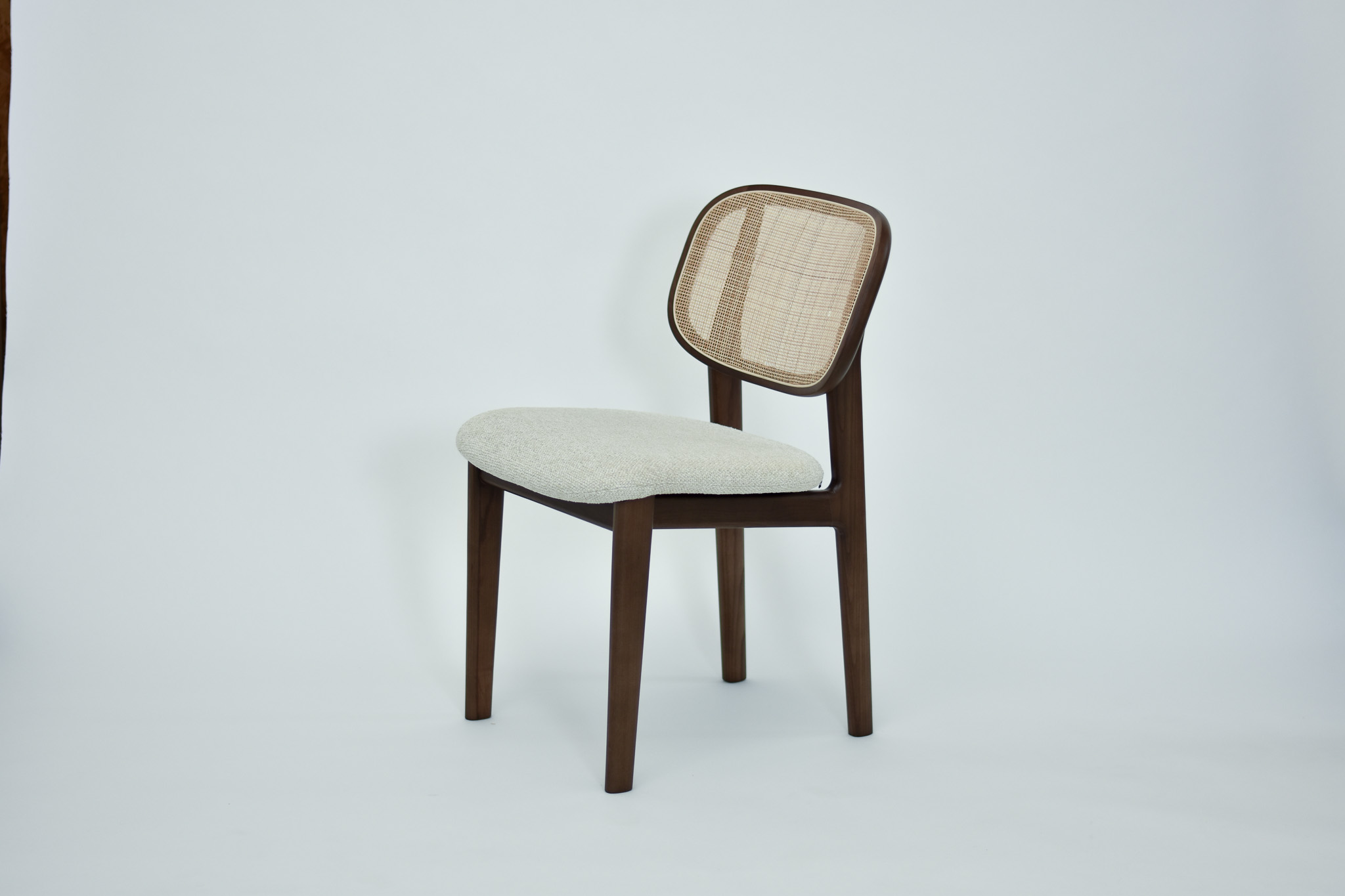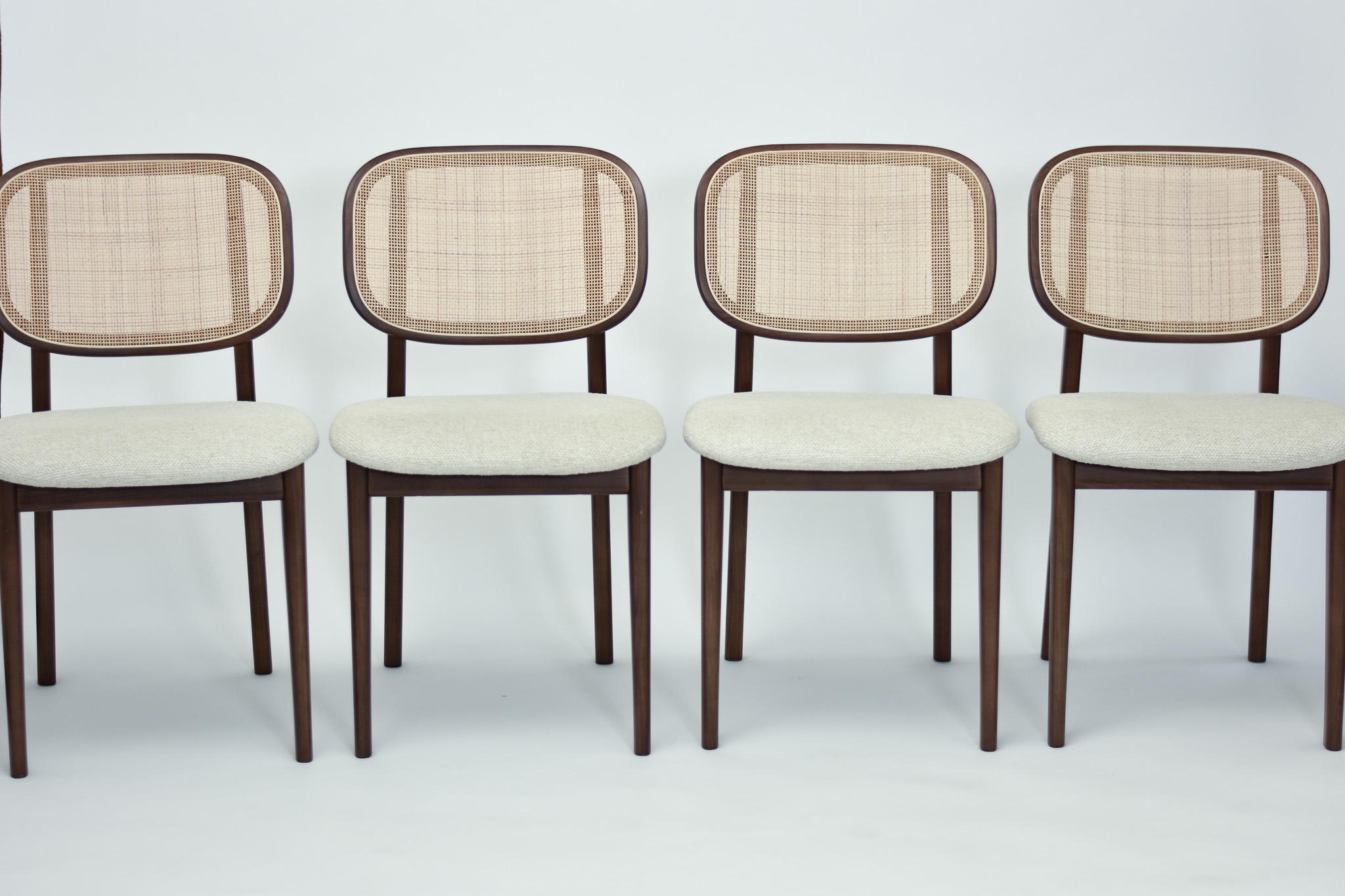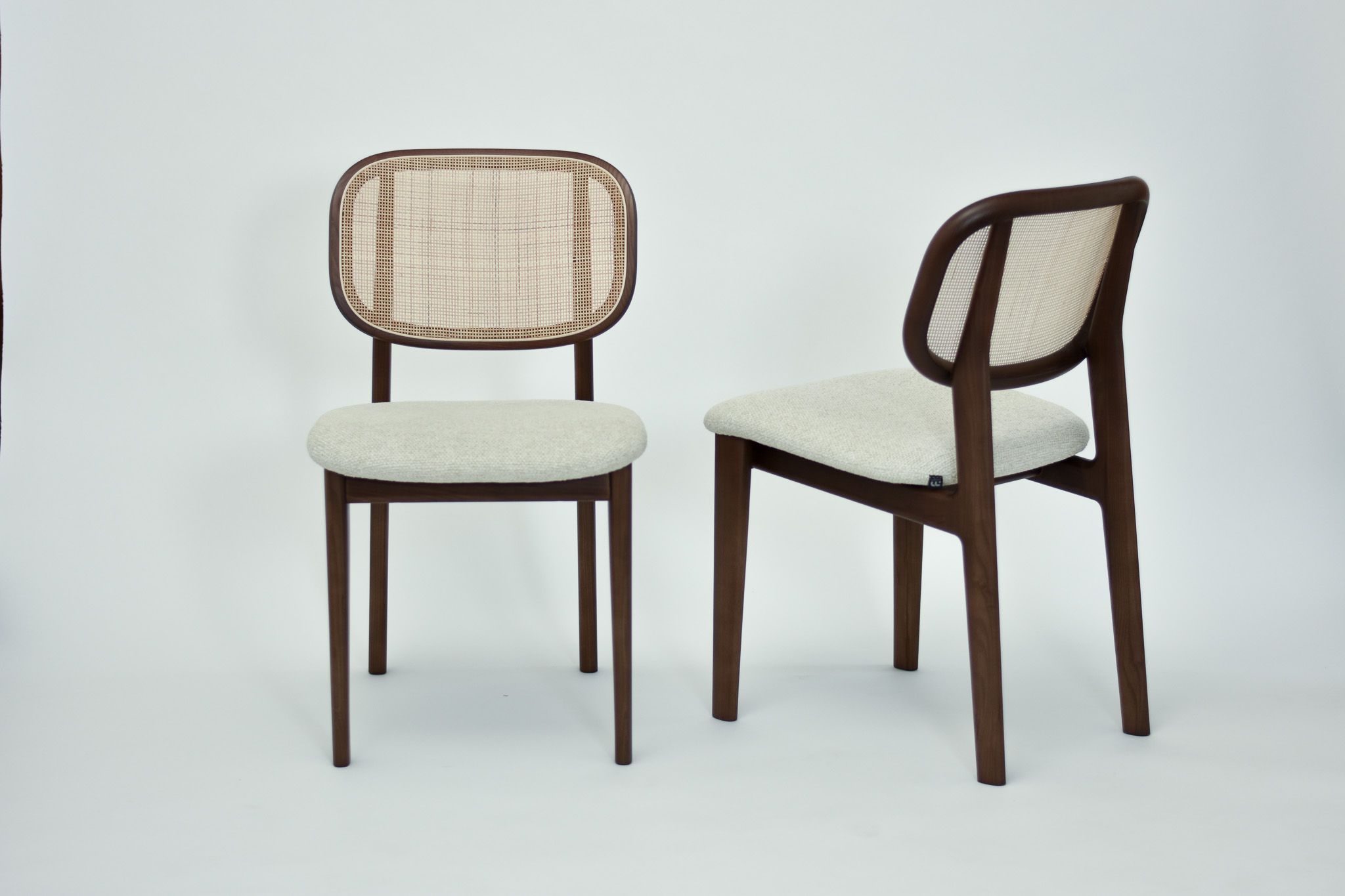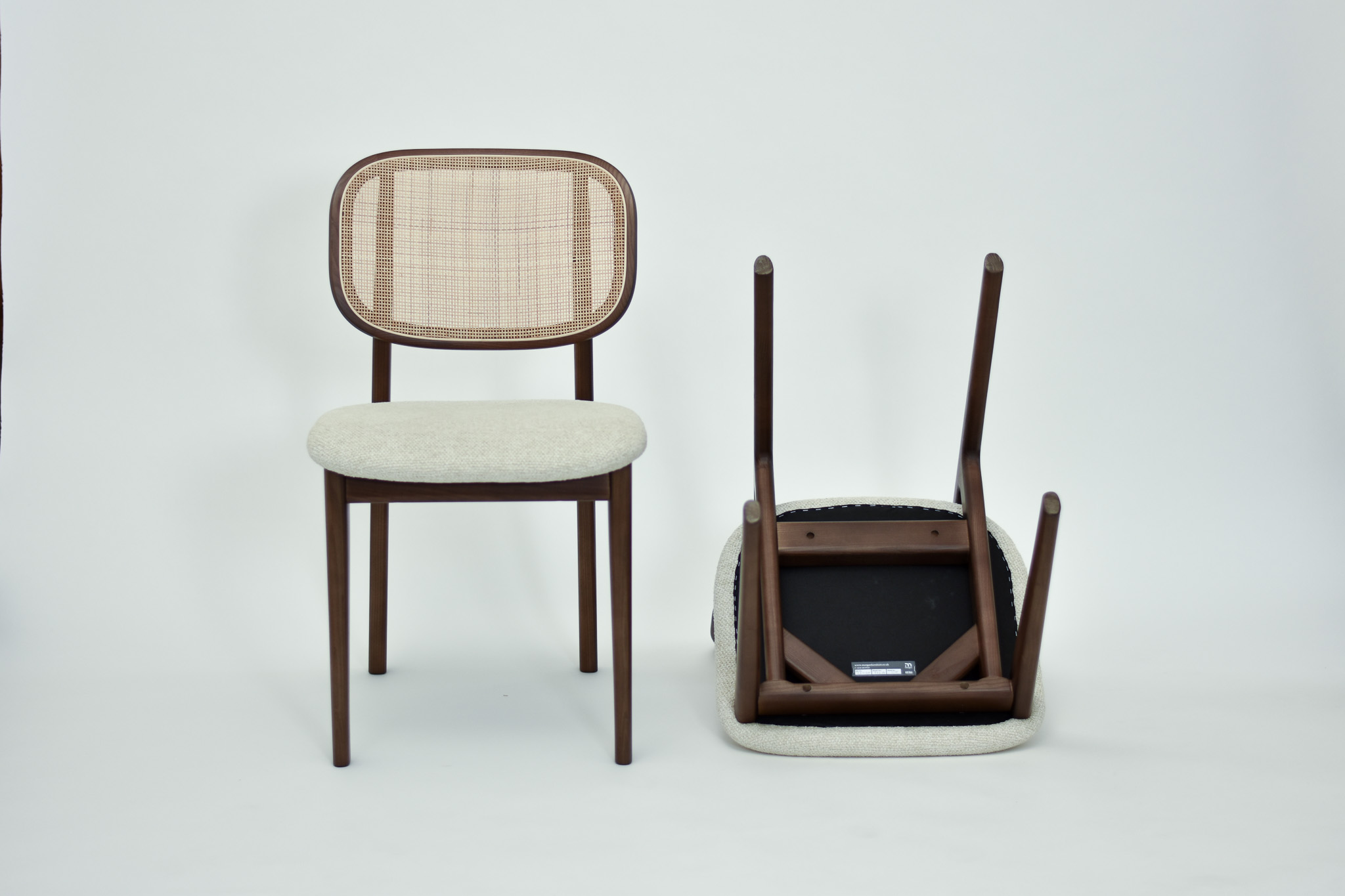 Split cane radio weave backrest and light grey tonal wool burlap seat pad.